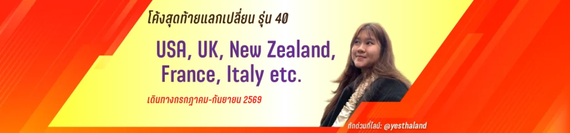 YES เปิดสอบชิงทุน “ยุวทูต YES” (ฟรีเต็มจำนวน เปิดสอบ 1 ครั้งต่อปี) และทุนอื่นๆ อีกมากมายกว่า 18 ประเทศทั่วโลก ระยะเวลา 1 ภาคเรียน – 1 ปีการศึกษา