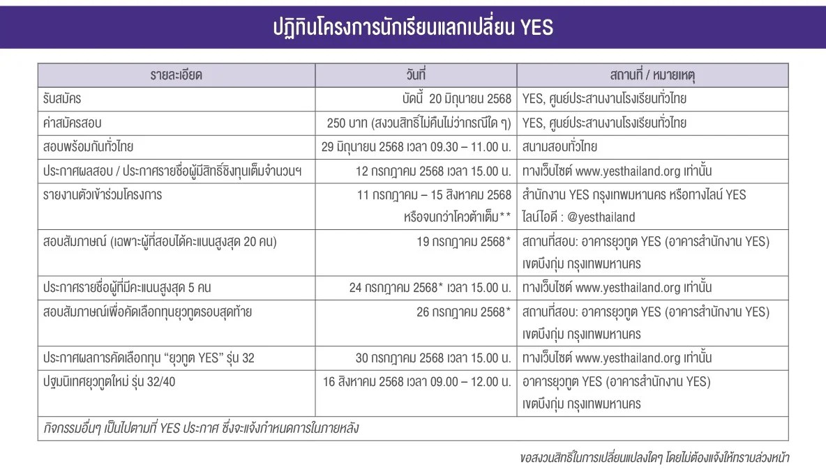 โครงการนักเรียนแลกเปลี่ยนนานาชาติ YES รุ่น 32/40 ปี 2026/2027เปิดรับสมัครสอบทุนเต็มจำนวน ทุนส่วนลดต่าง ๆ และทุนสมทบ รับสมัครนักเรียน ม.3-5 ในปีการศึกษา 2568 อายุระหว่าง 15 – 18.5 ปี ได้ศึกษาภาษาและวัฒนธรรมด้วยประสบการณ์ตรงในการใช้ชีวิตในประเทศต่าง ๆ เช่น อเมริกา แคนาดา เยอรมัน จีน หรือญี่ปุ่น เป็นต้น โดยโครงการฯ จัดหาโรงเรียนรัฐบาลหรือเอกชนระดับ High School ในท้องถิ่น และจัดให้นักเรียนพักกับครอบครัวอุปถัมภ์ซึ่งเป็นอสาสมัครของโครงการที่ได้รับคัดเลือกมาเป็นอย่างดี เพื่อทำหน้าที่ “ยุวทูต YES” อันจะนำมาซึ่งการสร้างสัมพันธภาพ และความเข้าใจอันดีงามระหว่างชนชาติต่าง ๆ ทั่วโลกต่อไป ในการนี้ถือเป็นการส่งเสริมความร่วมมือกันระหว่างประเทศเพื่อผดุงสันติภาพโลกอีกทางหนึ่งด้วย โดยนักเรียนไม่ต้องกลับมาเรียนซ้ำชั้นตามระเบียบการขอเทียบชั้นเรียนของกระทรวงศึกษาธิการ ทั้งนี้ขึ้นอยู่กับดุลยพินิจของโรงเรียน