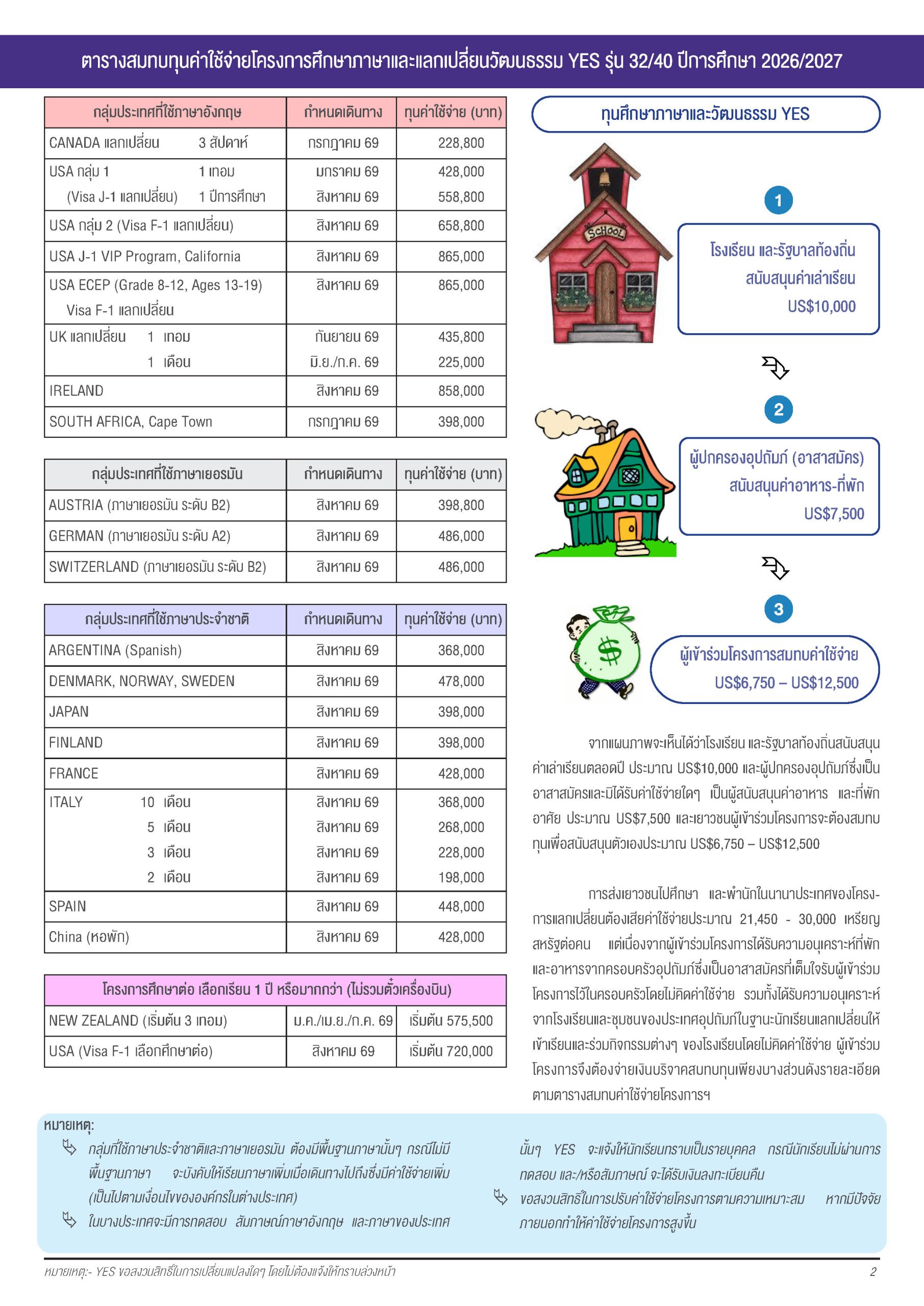 ค่าโครงการรวม ตั๋วเครื่องบิน ไป-กลับ, ค่าวีซ่า, ค่าประกันอุบัติเหตุและสุขภาพ, โรงเรียนและครอบครัวอุปถัมภ์, ค่ากิจกรรมอื่นๆ (ในประเทศ) ฯลฯ ตลอดระยะเวลาโครงการ
