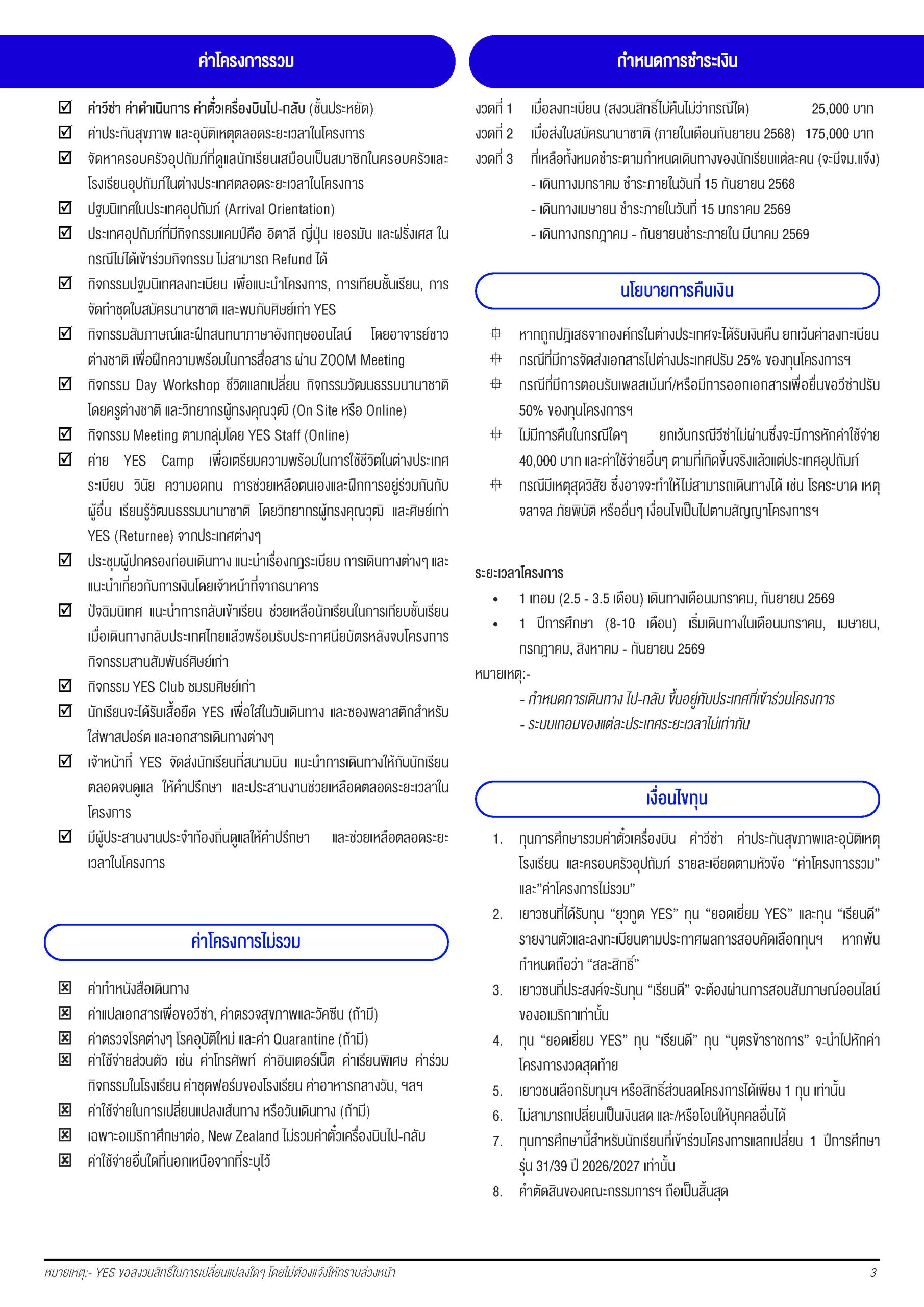 ค่าโครงการเริ่มต้นที่ 3.68 แสน ตั๋วเครื่องบินไป-กลับ วีซ่า ค่าประกันอุบัติเหตุและสุขภาพ โรงเรียน-ครอบครัวอุปถัมภ์ และกิจกรรมเตรียมความพร้อมในประเทศไทย ค่าใช้จ่ายส่วนตัวรายเดือน และอื่น ๆ
